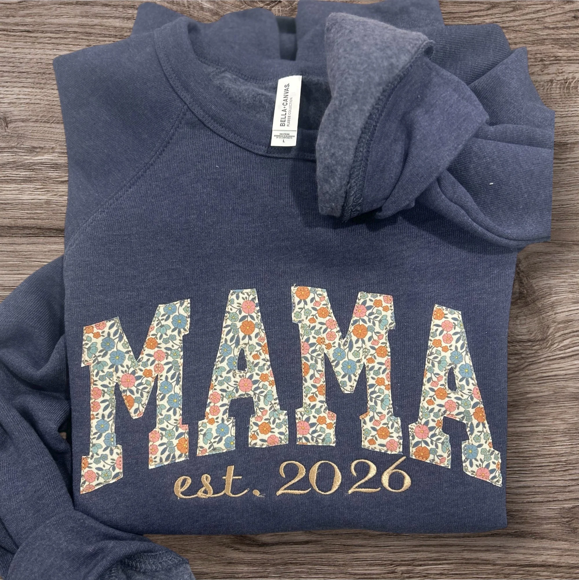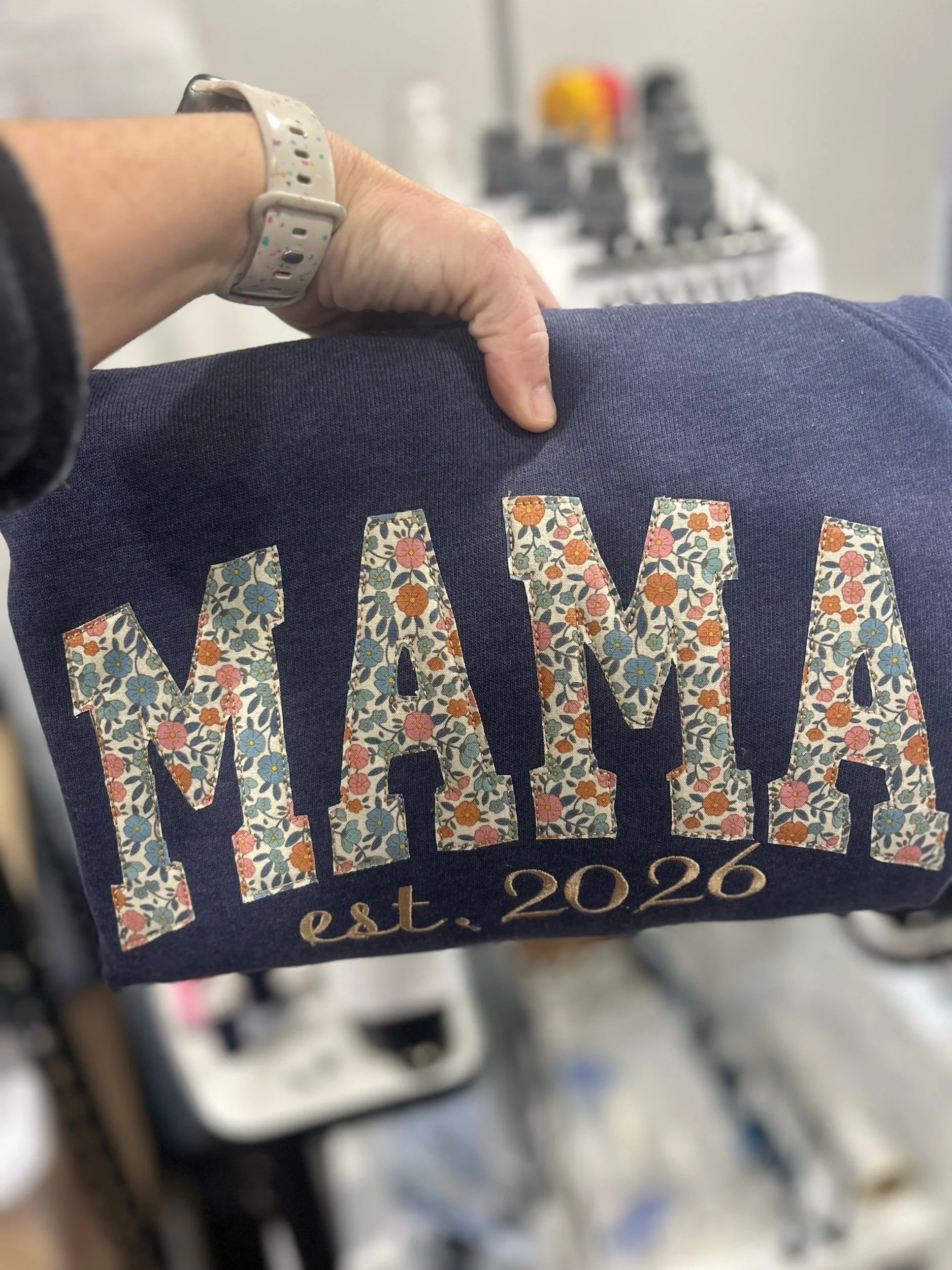 Show your style and pride with our Custom MAMA Appliqué Sweatshirt or Tee! Each piece is handmade with care, featuring your choice of thread color, sweatshirt or t-shirt style, and fabric appliqué — giving every item a one-of-a-kind look that’s totally you.